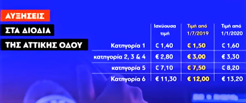 Οι αυξήσεις θα επιβληθούν σε δύο διαδοχικές φάσεις: Από 1η Ιουλίου, τα διόδια για τα Ι.Χ. αυτοκίνητα θα ανέλθουν στα 3 ευρώ, από 2,80 ευρώ που είναι σήμερα, και, από 1η Ιανουαρίου 2020, θα αυξηθούν εκ νέου, στα 3,30 ευρώ.