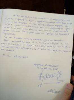 Στο βιβλίο συλλυπητηρίων, ο Δημήτρης Κουτσούμπας έγραψε: «Η ΚΕ του ΚΚΕ, οι κομμουνιστές και οι κομμουνίστριες της Ελλάδας, οι αγωνιζόμενοι Έλληνες εργαζόμενοι, αποτίουμε βαθύ φόρο τιμής στη μνήμη του συντρόφου Δημήτρη Χριστόφια, εξέχοντα παράγοντα του διεθνούς εργατικού και κομμουνιστικού κινήματος, αναγνωρισμένο ηγέτη του ΑΚΕΛ και συνολικά του Κυπριακού λαού, που τον υπηρέτησε από πολλές εξέχουσες θέσεις μέχρι αυτήν του προέδρου της Κυπριακής Δημοκρατίας.