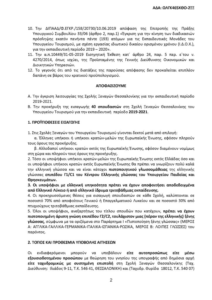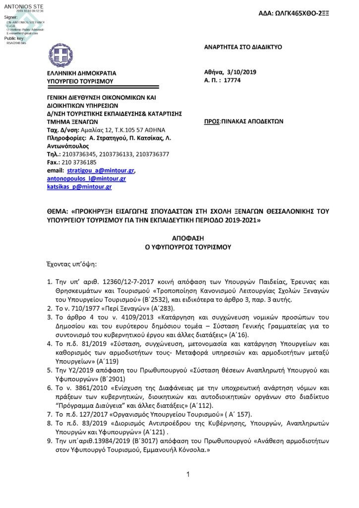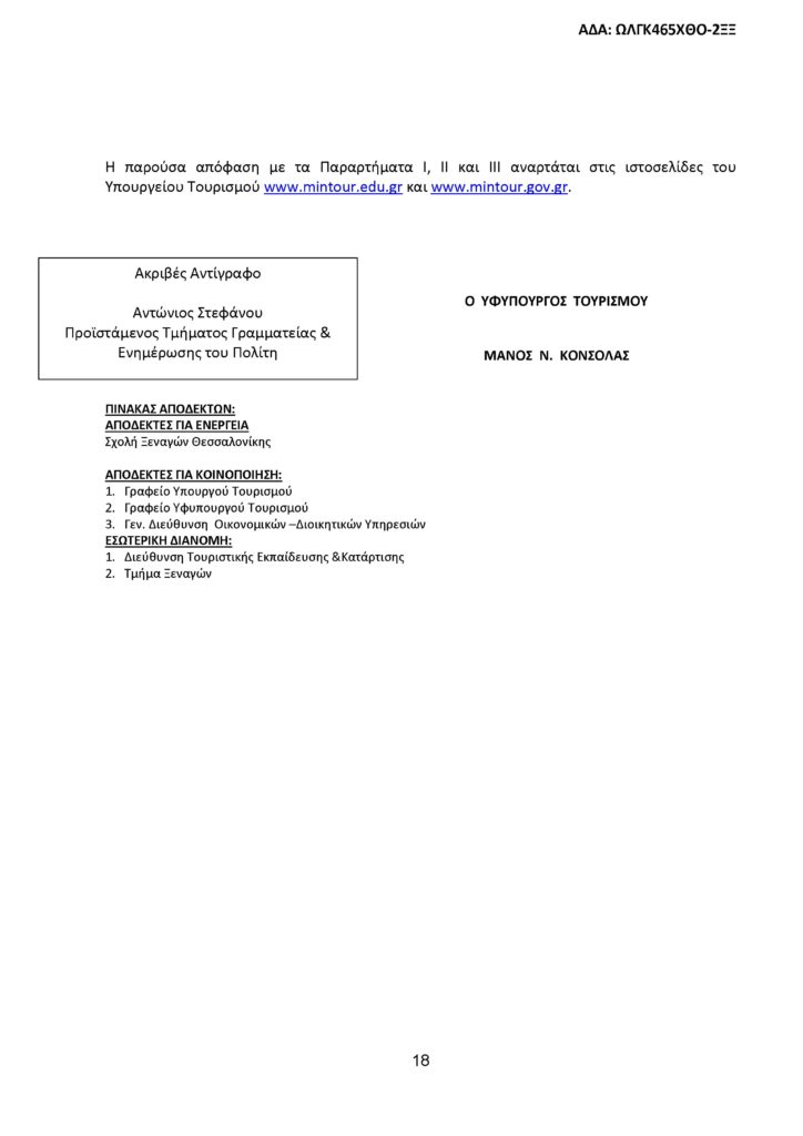Την προκήρυξη για την εισαγωγή 40 σπουδαστών στη Σχολή Ξεναγών Θεσσαλονίκης υπέγραψε ο Υφυπουργός Τουρισμού, Μάνος Κόνσολας.