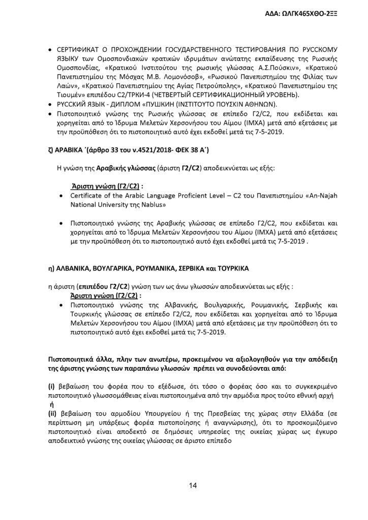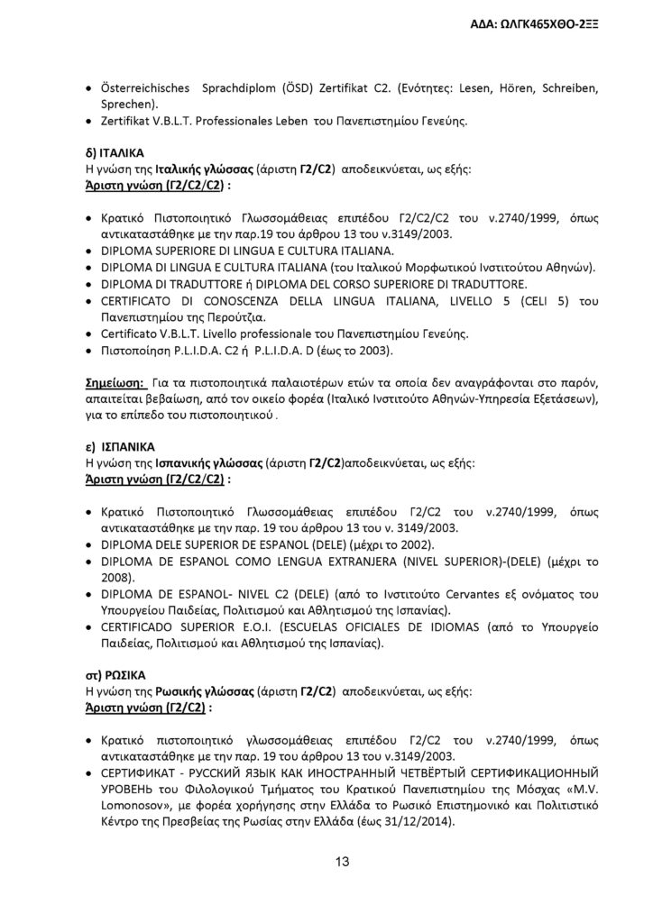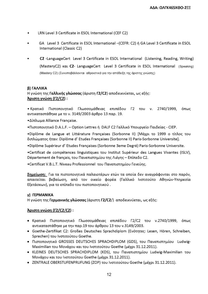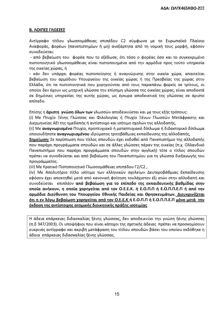 Όλοι οι υποψήφιοι, ανεξαρτήτως του τίτλου σπουδών που κατέχουν, πρέπει να έχουν πιστοποιημένη άριστη γνώση επιπέδου Γ2/C2, τουλάχιστον μιας (πέραν της ελληνικής) ξένης γλώσσας.