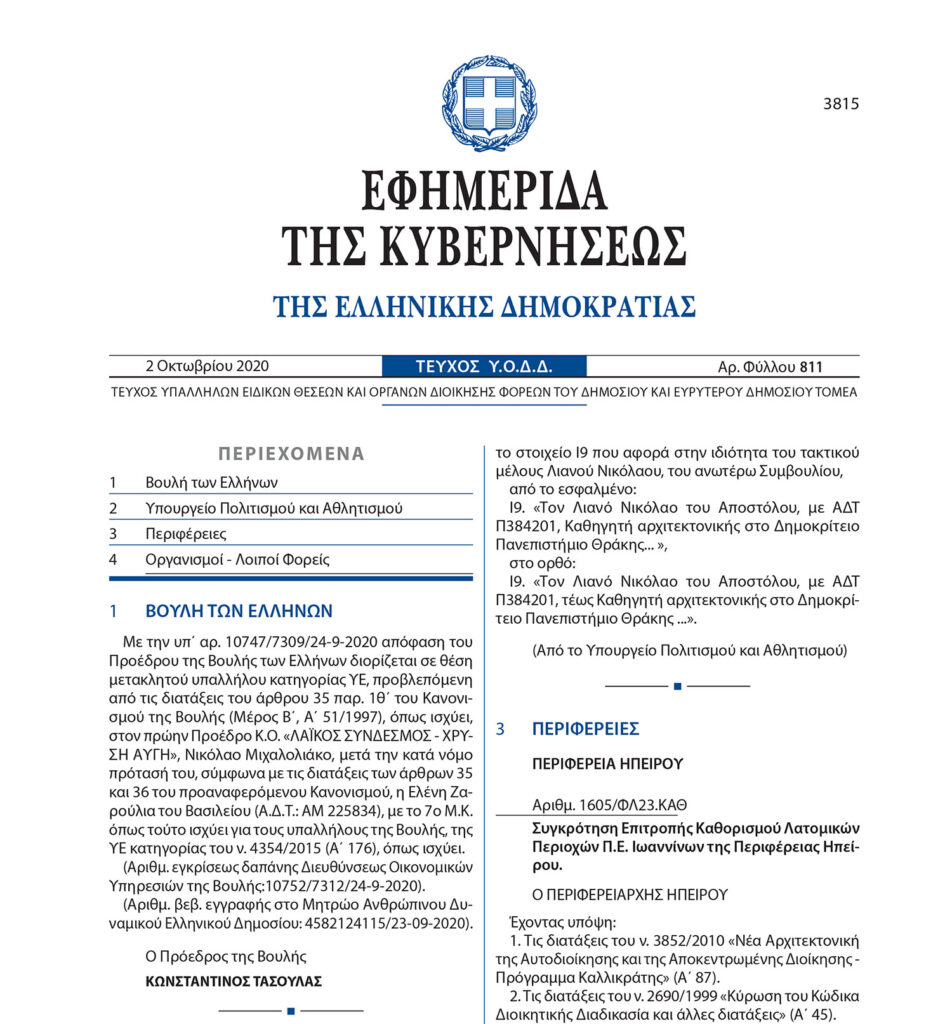 Πέντε ημέρες πριν την ανακοίνωση της απόφασης του δικαστηρίου για την πολύκροτη δίκη της Χρυσής Αυγής, δημοσιεύτηκε αιφνιδιαστικά στο φύλλο της «Εφημερίδας της Κυβερνήσεως», με αριθμό 811 απόφαση, η οποία αναφέρει: «Με την υπ’ αρ. 10747/7309/24-9-2020 απόφαση του προέδρου της Βουλής των Ελλήνων διορίζεται σε θέση μετακλητού υπαλλήλου κατηγορίας ΥΕ, (…) στον πρώην πρόεδρο ΚΟ “ΛΑΪΚΟΣ ΣΥΝΔΕΣΜΟΣ – ΧΡΥΣΗ ΑΥΓΗ”, Νικόλαο Μιχαλολιάκο, μετά την κατά νόμο πρότασή του, (…) η Ελένη Ζαρούλια του Βασιλείου (…)».