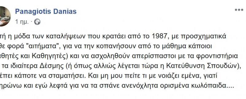 Για «μόδα καταλήψεων» στα σχολεία κάνει λόγο σε ανάρτησή του στο Facebook ο πρόεδρος της Ένωσης Διοικητικών Δικαστών, Παναγιώτης Δανιάς, αποκαλώντας τους μαθητές «κωλόπαιδα» και τα αιτήματά τους  για ασφαλές άνοιγμα των σχολείων προσχηματικά!
