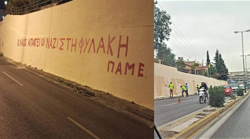 Με εντολή του δημάρχου Περάματος του ΣΥΡΙΖΑ Γιάννη Λαγουδάκη σβήνεται το σύνθημα από τοίχους «Ο λαός απαιτεί, οι Ναζί στη φυλακή»!
