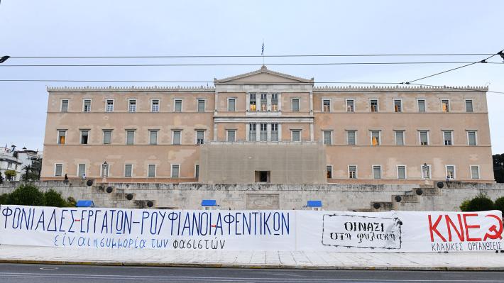 Πανό της ΚΝΕ μπροστά στη Βουλή: «Φονιάδες εργατών-ρουφιάνοι αφεντικών είναι η συμμορία των φασιστών»