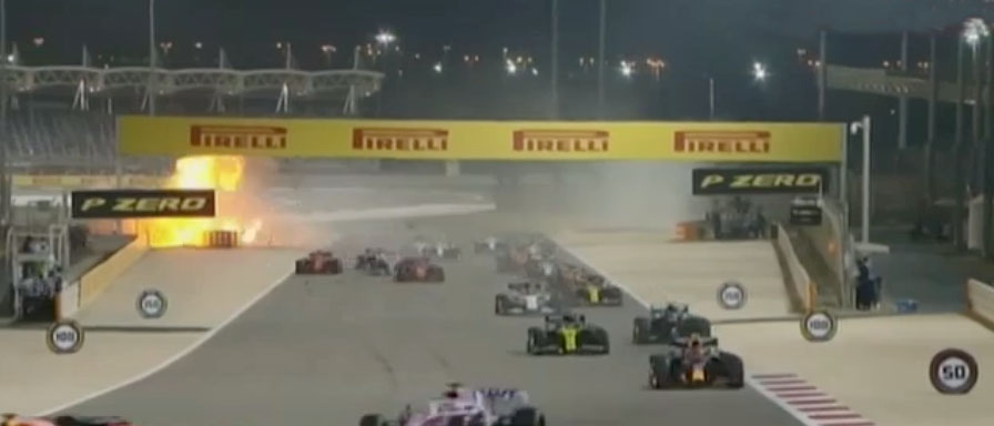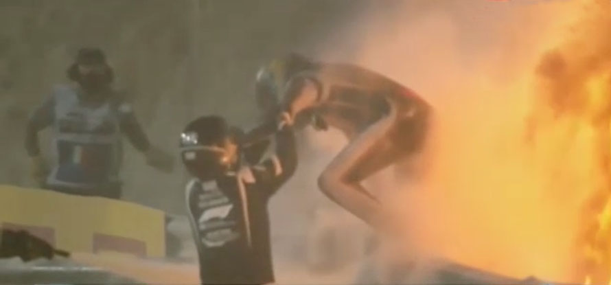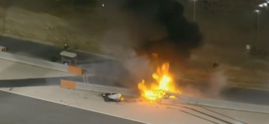 Το μονοθέσιο του Ρομέν Γκροζάν κόπηκε στη μέση και τυλίχθηκε σε μια μπάλα φωτιάς, με τον πιλότο να απεγκλωβίζεται μόνος του. Σύμφωνα με τις πρώτες πληροφορίες, βγήκε από το όχημα με κάποια εγκαύματα στα χέρια και τα πόδια, ενώ πονούσε στα πλευρά.
