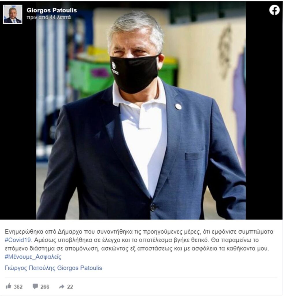 «Ενημερώθηκα από δήμαρχο που συναντήθηκα τις προηγούμενες μέρες, ότι εμφάνισε συμπτώματα Covid19. Αμέσως υποβλήθηκα σε έλεγχο και το αποτέλεσμα βγήκε θετικό», έγραψε.