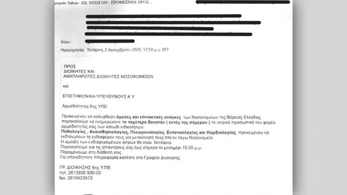 Η κυβέρνηση, μέσω του εγγράφου των ΥΠ.Ε, καλεί τις διοικήσεις των υποστελεχωμένων δημόσιων νοσοκομείων και των επιστημονικών υπευθύνων των Κέντρων Υγείας, «προκειμένου να καλυφθούν άμεσες και επιτακτικές ανάγκες των νοσοκομείων της Βόρειας Ελλάδας», να ενημερώσουν «το ταχύτερο δυνατόν (εντός της σήμερον), το ιατρικό προσωπικό των κάτωθι ειδικοτήτων: Παθολογίας, Αναισθησιολογίας, Πνευμονολογίας, Εντατικολογίας και Καρδιολογίας, προκειμένου να εκδηλώσουν το ενδιαφέρον τους για μετακίνησή τους στα εν λόγω νοσοκομεία».