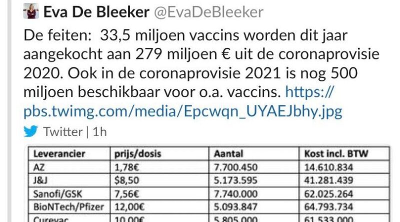 Αναλυτικό πίνακα με τις μυστικές τιμές που  διαπραγματεύθηκε η Ευρωπαϊκή Επιτροπή για τα έξι εμβόλια κατά της COVID-19, τα οποία έχει εξασφαλίσει για τους Ευρωπαίους πολίτες, ανήρτησε την Πέμπτη στο Twitter η υφυπουργός Προϋπολογισμού του Βελγίου Εύα ντε Μπλέκερ, πληροφορία την οποία λίγο αργότερα διέγραψε.