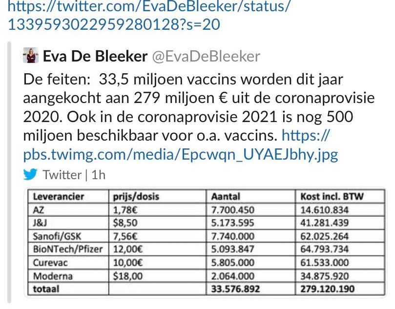 Της ανάρτησης είχε προηγηθεί συζήτηση στο Κοινοβούλιο του Βελγίου σχετικά με τα κονδύλια που έχουν προβλεφθεί για την αγορά εμβολίων. Η Εύα Ντε Μπλέκε, τόνισε ότι τα κονδύλια έχουν προβλεφθεί και, για να στηρίξει τη θέση της, δημοσίευσε τον πίνακα με τις αναλυτικές τιμές, τα ονόματα των προμηθευτών και τον αριθμό των δόσεων, ανάρτηση την οποία στη συνέχεια «κατέβασε», έπειτα από διαβούλευση με την κυβέρνηση.
