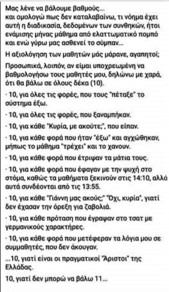 Σε ένα κείμενο με λιγότερες από 200 λέξεις, καταδεικνύει την εξοργιστική προχειρότητα και τον ταξικό διαχωρισμό με τον οποίο διεξάγεται η τηλεκπαίδευση, καταργώντας ουσιαστικά κάθε έννοια παροχής ουσιαστικής μόρφωσης στα παιδιά της πρωτοβάθμιας εκπαίδευσης.