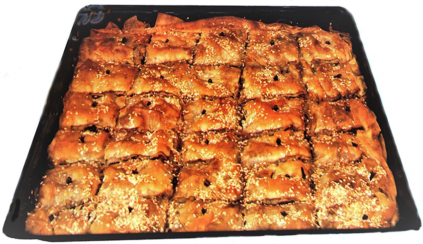 Αλείφουμε το ταψί μας με λάδι. Στρώνουμε δύο φύλλα και απλώνουμε το μίγμα καλά. Καλύπτουμε το μίγμα με δύο ακόμα φύλλα. Περιχύνουμε επάνω στα φύλλα λάδι και ύστερα σκορπίζουμε το σουσάμι.