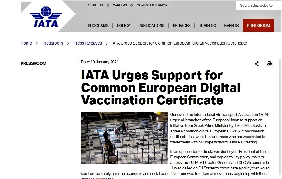 Να στηρίξουν την πρόταση του Έλληνα πρωθυπουργού για την καθιέρωση ενός κοινού ψηφιακού πιστοποιητικού εμβολιασμού κατά του COVID-19, με το οποίο οι εμβολιασθέντες θα έχουν τη δυνατότητα να ταξιδεύουν ελεύθερα στην Ευρώπη χωρίς τεστ κορωνοϊού και άλλες «γραφειοκρατικές καθυστερήσεις», καλεί τα κράτη-μέλη της Ε.Ε. η Παγκόσμια Ένωση Αερομεταφορών (ΙΑΤΑ), σε ανοικτή επιστολή της προς την πρόεδρο της Ευρωπαϊκής Επιτροπής.