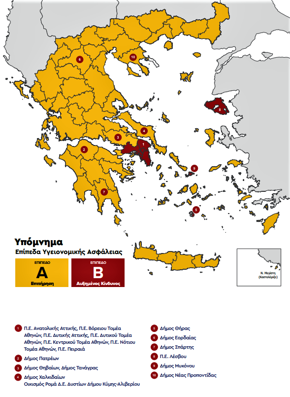 Στο Χάρτη Υγειονομικής Ασφάλειας και Προστασίας, η Ελλάδα χωρίζεται σε «κίτρινες» (Επίπεδο Α – Επιτήρησης) και σε «κόκκινες» (Επίπεδο Β – Αυξημένου Κινδύνου) περιοχές ανάλογα με το επιδημιολογικό φορτίο που φέρουν.
