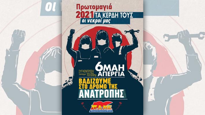 Με σύνθημα «Τα κέρδη τους – Οι νεκροί μας! Βαδίζουμε στο δρόμο της ανατροπής!», το ΠΑΜΕ απευθύνει πλατύ κάλεσμα προς τις συνδικαλιστικές Οργανώσεις και τους εργαζόμενους να οργανώσουν την απεργιακή τους απάντηση στις 6 Μαΐου. Όπως αναφέρει, «τιμώντας τους νεκρούς της τάξης μας και απαντώντας αγωνιστικά στο αντεργατικό νομοσχέδιο-έκτρωμα της κυβέρνησης που φέρνει τις ανατροπές του αιώνα.