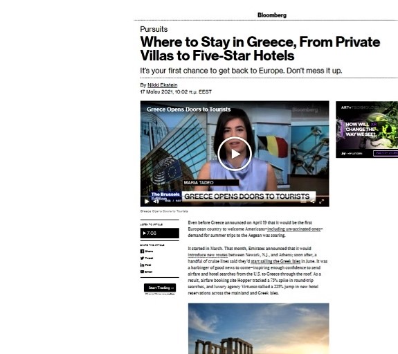 «Ακόμη και πριν η Ελλάδα ανακοινώσει στις 19 Απριλίου ότι θα ήταν η πρώτη ευρωπαϊκή χώρα που θα υποδεχόταν τους Αμερικανούς –συμπεριλαμβανομένων των μη εμβολιασμένων– η ζήτηση για καλοκαιρινά ταξίδια στο Αιγαίο είχε αυξηθεί», αναφέρει σε αφιέρωμα για τον ελληνικό τουρισμό το πρακτορείο ειδησεογραφικό Bloomberg.