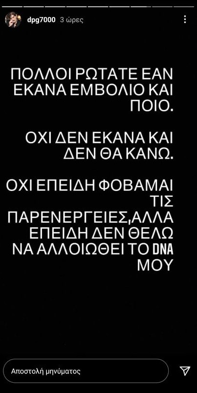 «Πολλοί ρωτάτε αν έκανα εμβόλιο και ποιο. Όχι δεν έκανα και δεν θα κάνω. Όχι επειδή φοβάμαι τις παρενέργειες, αλλά επειδή δεν θέλω να αλλοιωθεί το DNA μου», ήταν το μήνυμα που εξέπεμψε σε story που «ανέβασε» στο instagram ο πρόεδρος του διοικητικού συμβουλίου και διευθύνων σύμβουλος της φαρμακευτικής εταιρείας ΒΙΑΝΕΞ, πρόεδρος του Συλλόγου Αντιπροσώπων Φαρμακευτικών Ειδών και Ειδικοτήτων (Σ.Α.Φ.Ε.Ε.) και μεγαλομέτοχος της Καλαθοσφαιρικής Ανώνυμης Εταιρείας Παναθηναϊκός.