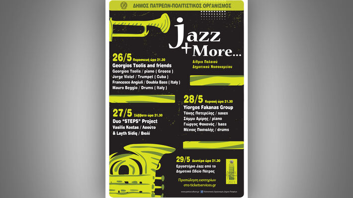 Η ενότητα Jazz & more θα ολοκληρωθεί τη Δευτέρα 29 Μαΐου με το Εργαστήρι Jazz από το Δημοτικό Ωδείο Πάτρας. Το εργαστήρι θα πραγματοποιηθεί στο αίθριο του Παλαιού Δημοτικού Νοσοκομείου στις 9.30 το βράδυ.