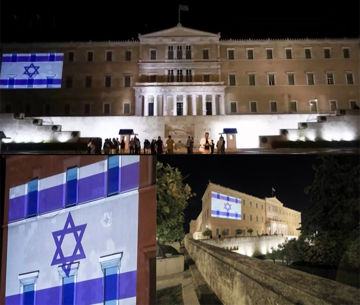 Με τη σημαία του κράτους του Ισραήλ φωταγωγήθηκε την Τετάρτη το βράδυ το κτίριο του Κοινοβουλίου, «σε ένδειξη συμπαράστασης προς τον ισραηλινό λαό για τις απάνθρωπες τρομοκρατικές επιθέσεις που υπέστη από τη Χαμάς», όπως υποστηρίζεται σε ανακοίνωση της Βουλής.