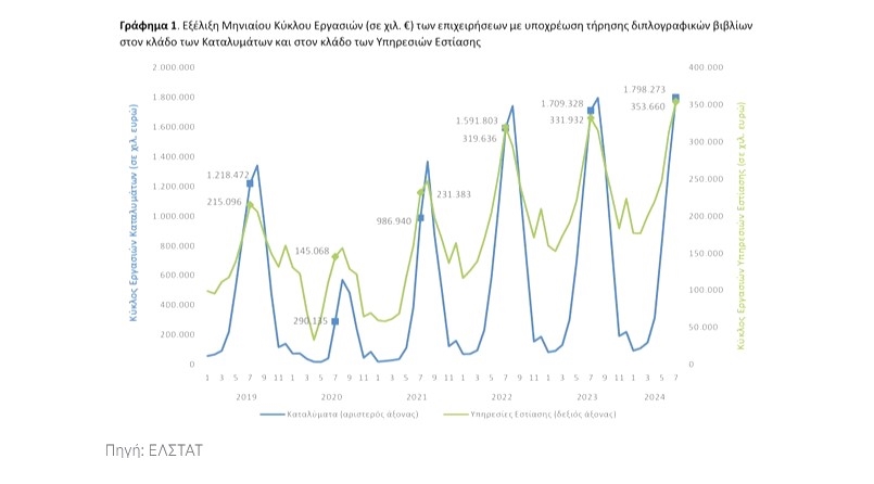 Αθροιστικά για τις επιχειρήσεις στους κλάδους των καταλυμάτων και των υπηρεσιών εστίασης με υποχρέωση τήρησης διπλογραφικών βιβλίων, ο κύκλος εργασιών τον φετινό Ιούλιο ανήλθε σε 2,152 δισ. ευρώ, σημειώνοντας αύξηση 5,4% σε σχέση με τον περσινό Ιούλιο, οπότε και είχε διαμορφωθεί σε 2,041 δισ. ευρώ.